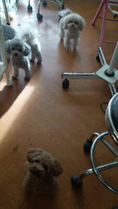 ぴょんぴょんとトリミングテーブルまで上がりました。
