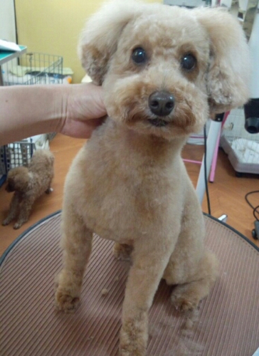 トリミング前はウロウロしたり隠れたりしていますが、終わるとドアの前でジッと座っています。